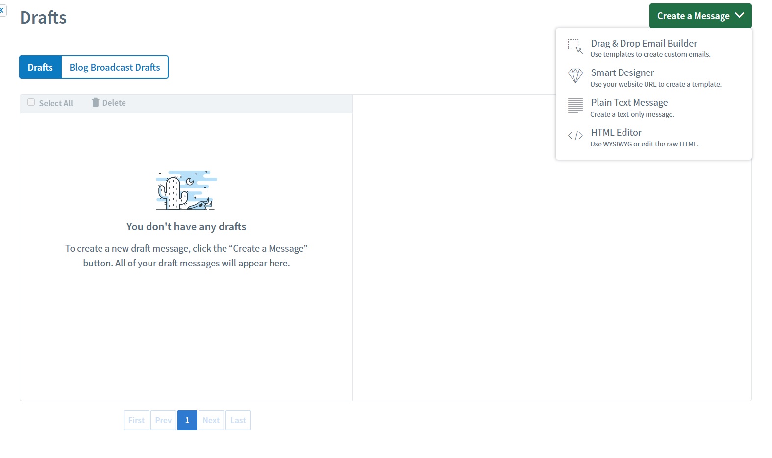 Jeśli nie masz jeszcze projektu pierwszej wiadomości, to po prawej stronie u góry znajduje się zielony przycisk „Create a Massage”. Kliknij i wybierz, jakiego typu projekt chcesz stworzyć. Użyj pierwszej opcji od góry, jeśli chcesz użyć kreatora e-maili i gotowych szablonów. Na drugim miejscu jest “inteligentny projektant”, który tworzy szablon wiadomości po podaniu URL strony internetowej. Trzecia opcja to zwykła wiadomość tekstowa, a ostatnia to edytor HTML.