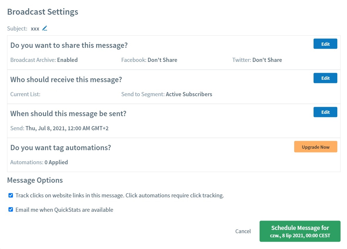 Na ekranie pojawi się kilka opcji. Pierwsza z nich dotyczy możliwości udostępniania wiadomości m.in. w mediach społecznościowych. Kliknij „Edit”, aby zmienić ustawienia. Kolejna opcja to wybór listy subskrybentów, do których ma dotrzeć wiadomość. Możesz edytować również jej ustawienia wybierając „Edit”. W rubryce „When should this message be sent?” możesz zaplanować datę i godzinę, o której Twoi odbiorcy otrzymają maila. Kliknij „Edit”.