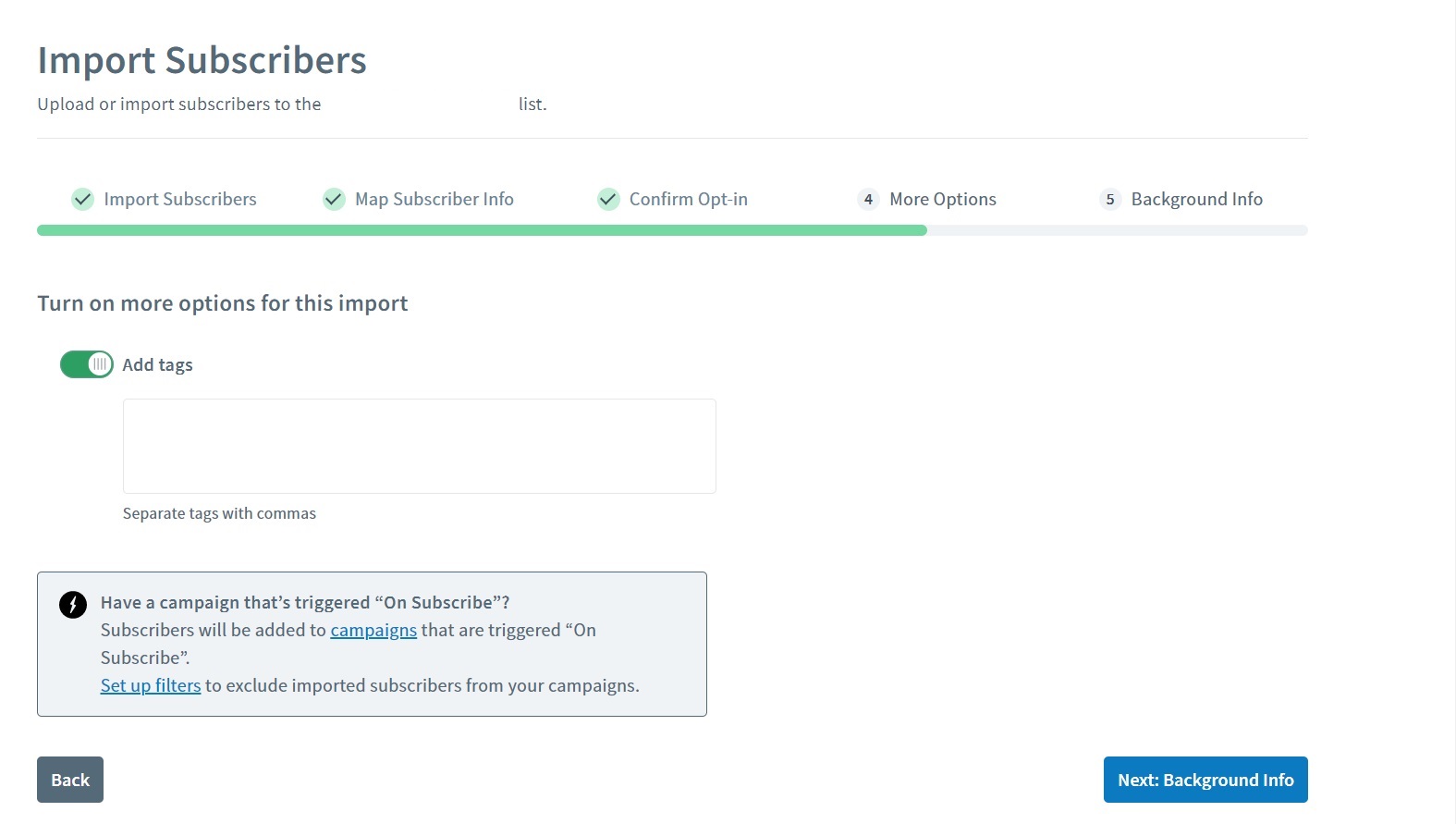 Po przejściu na następną stronę możesz włączyć opcję dodania tagów do tego importu. Włącz ją lub pomiń klikając „Next: Background info”.
